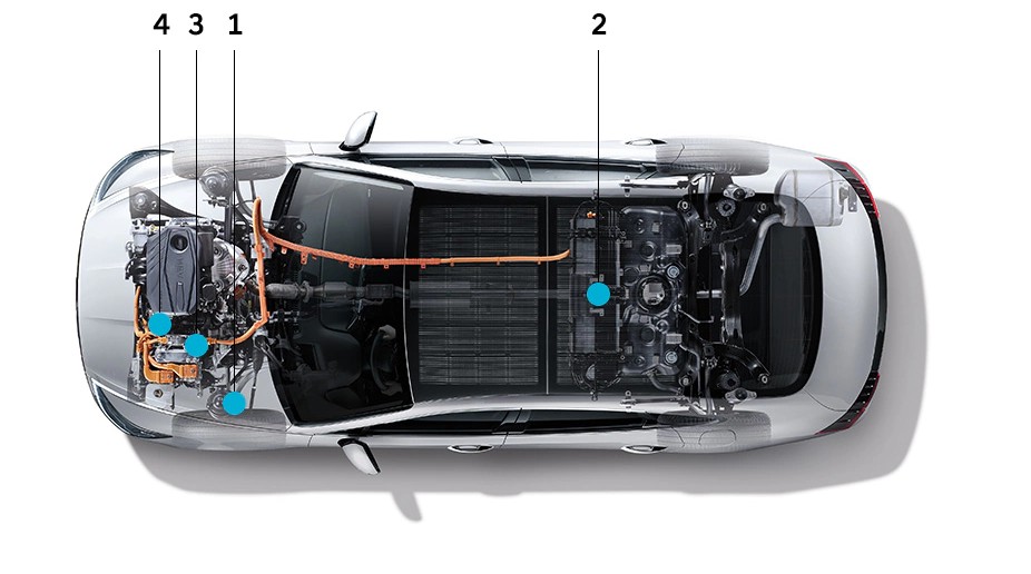 사진에 번호가 적혀있는데 1번은 회생제동 시스템으로 감속 시 전기에너지로 변환되어 배터리가 충전되고 이 충전된 배터리는 일반 주행할 때 쓰여 에너지 효율을 향상해 주는 역할을 합니다.